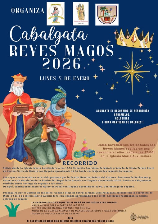 Com tots els anys els reis vénen al Camp d’Elx. Enguany aquest és el recorregut: 17:30h Eixida des del Centre Cívic de Matola passant a continuacio per l’Ermita de Carmen. 18:30h Lliurament de regals en l’Ermita d’Angel (Algoda) 20:00h Lliurament de regals en el Museu de Puçol 22:00h Lliurament de regals a l’església Maria Auxiliadora … Leer más